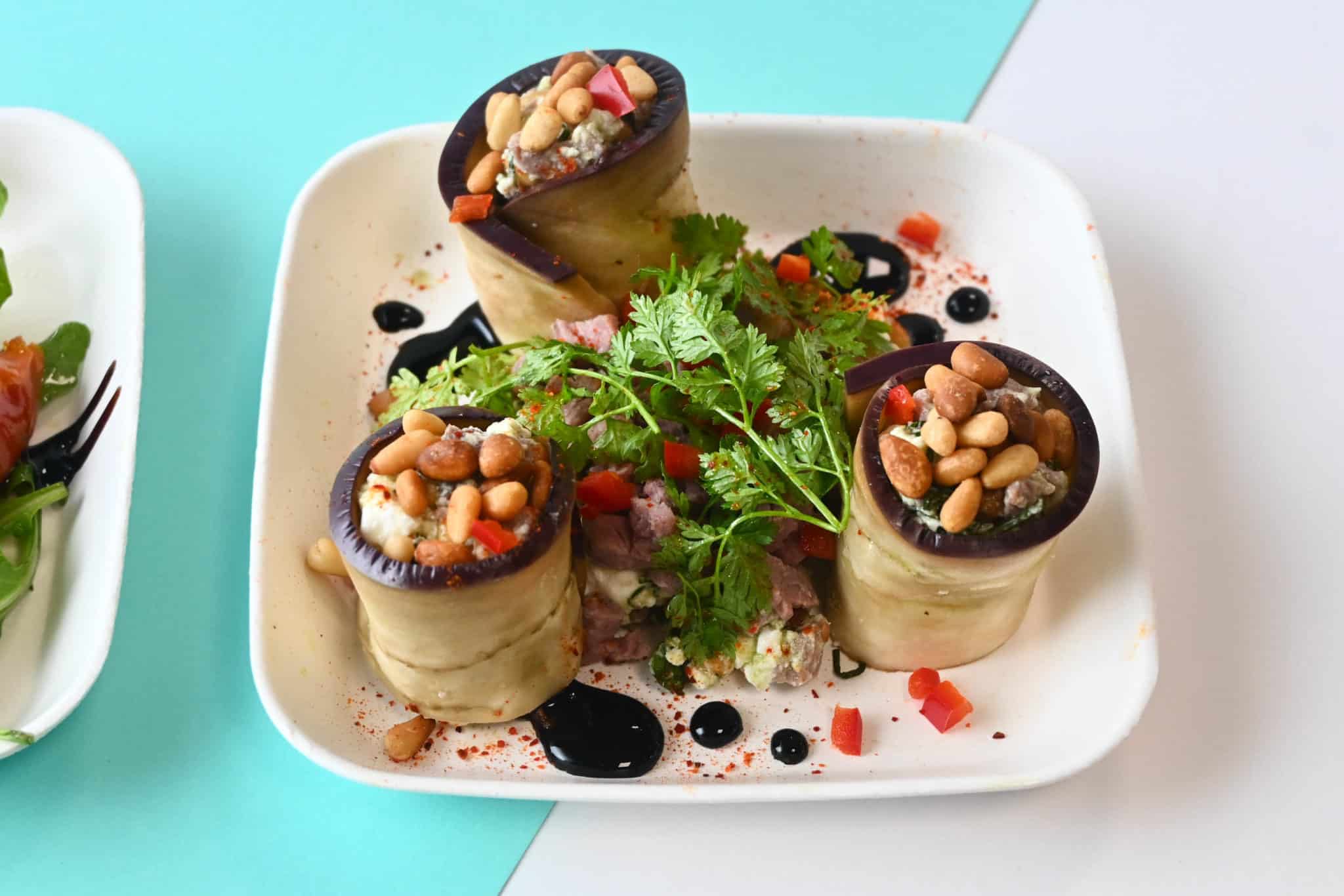 Roulé d’aubergine et agneau à l’huile de menthe*
