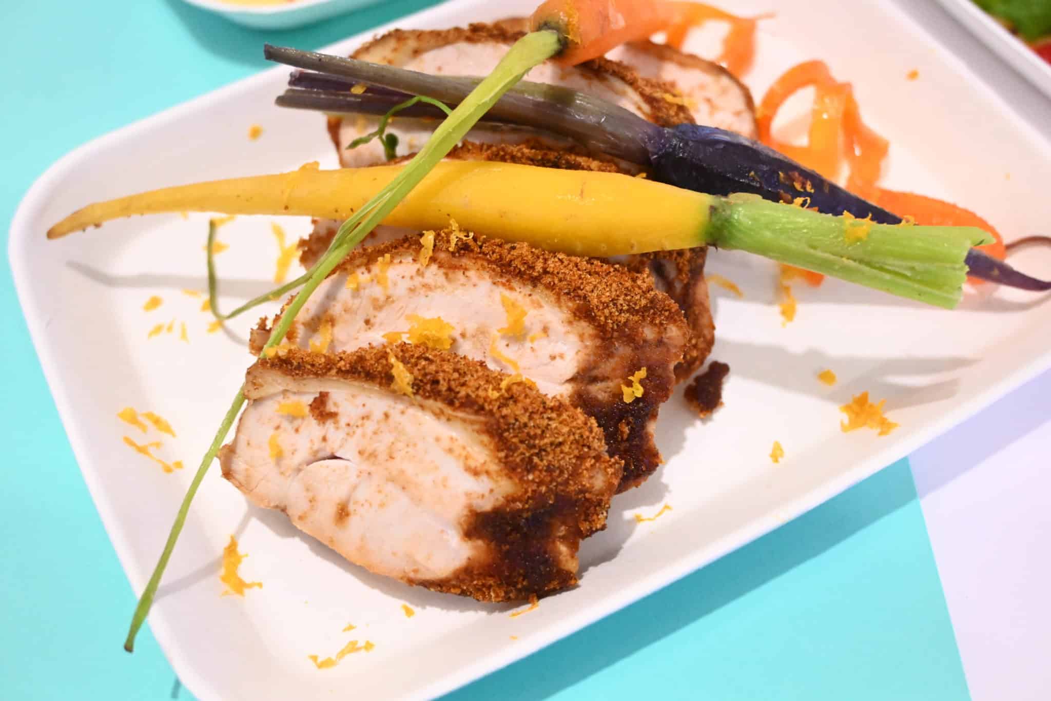 Emincé de filet de volaille au pain d’épices, carotte multicolore à l’orange**